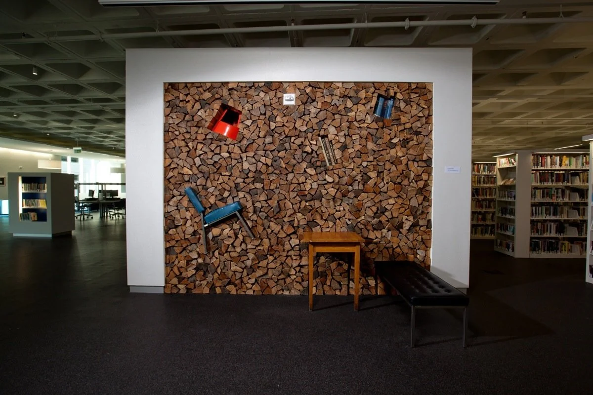 ![]()  "Stack 1.25 (Komíny Series)" (2013) by Heath Matysek-SnyderWood and furniture “This grouping of materials takes shape as furniture, as sculptural installation and as interior-architecture. Alternating between nesting inside of structures, filling architectural niches or surrounding found objects, I am intrigued by the visual patterns and textures of stacked materials. Over several years I’ve developed the Komíny Series, a body of work that investigates themes of place and identity through the act of stacking firewood. I, like many others, have a very specific and real history with the cutting, splitting and stacking of firewood. Growing up, my family heated with wood and collecting it was a year round family task. The Komíny (Czech for ‘stacks’) that I create, incorporate meaningful objects directly into firewood stacks. The embedded artifacts range from books to chairs to tractors, signifying different places, cultures and histories depending on the chosen objects and locations.” —Heath Matysek-Snyder