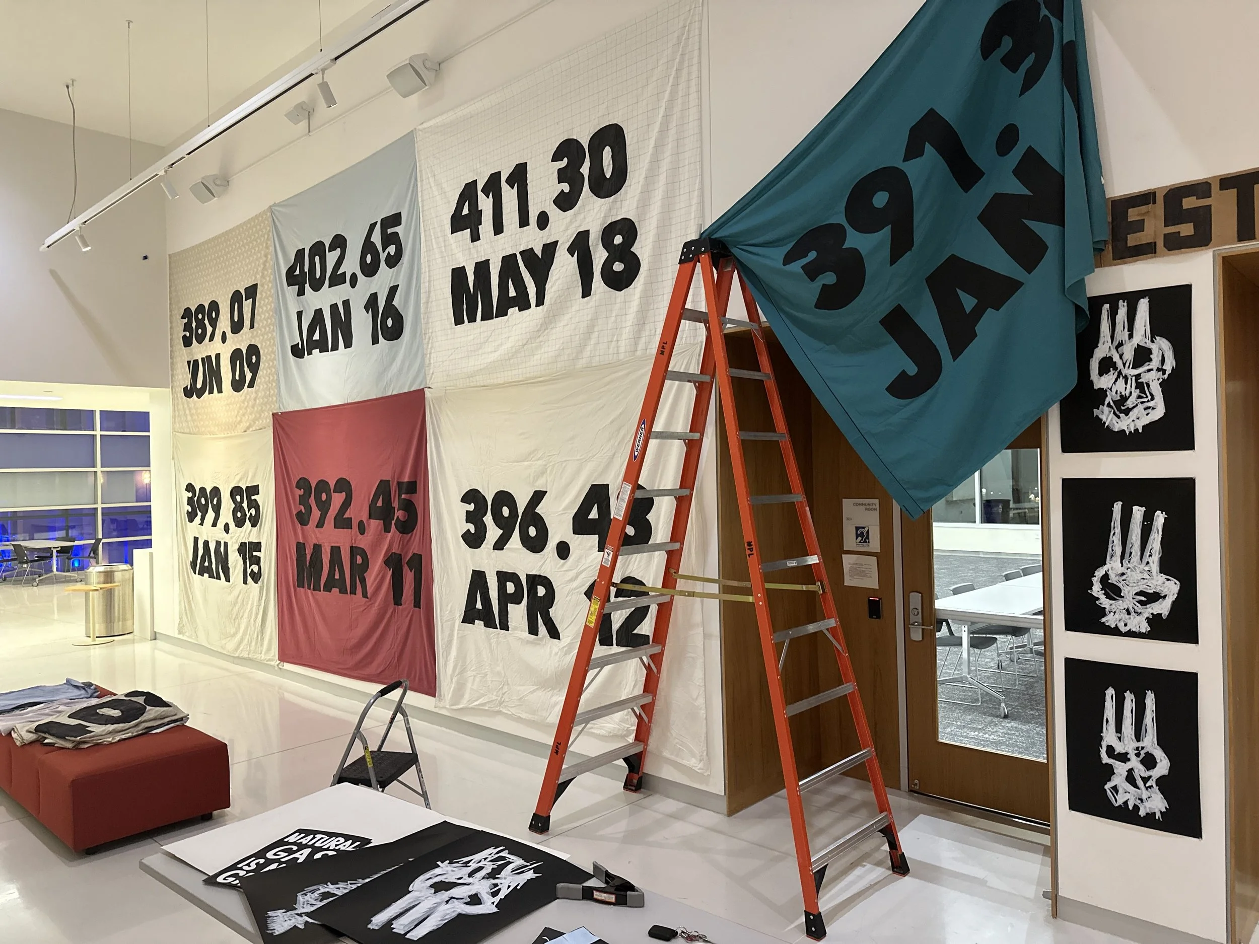 Wake Up! is a community-generated, multi-year project focusing on the climate crisis. TetraPAKMAN says his aim is to merge social commentary, carbon emissions data, and collective action. Utilizing the monthly data provided by The Keeling Curve, a daily record of global atmospheric carbon dioxide concentration maintained by Scripps Institution of Oceanography at UC San Diego, TetraPAKMAN invites community members to paint the month, year, and the coinciding CO2 emissions in parts per million (ppm) directly onto climate sheets (repurposed bed sheets). He says these unique canvases have generated dynamic conversations about privilege and its place within the climate crisis.