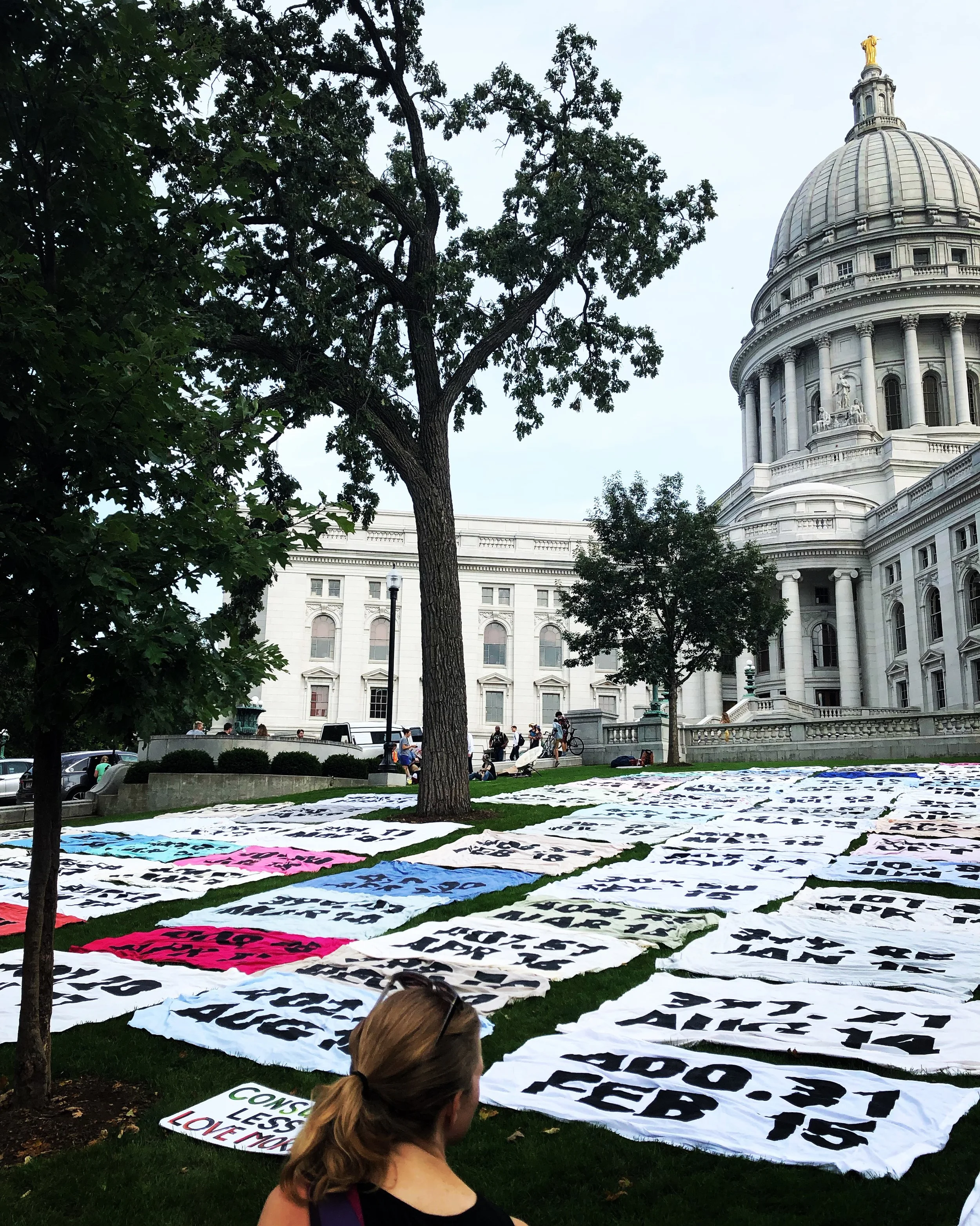 TetraPAKMAN began working the CO2 emission data into his art practice in 2015 and later began capturing the numbers and dates in this format in 2019, in alignment with the Global Climate Strike. Previous iterations of Wake Up! include temporary installations at locations such as the Madison Capitol lawn, Garver Feed Mill, Communication Madison exterior, UW–Madison School of Education Gallery, Dark Star Bar, and most recently as an exhibition at the Social Justice Center.